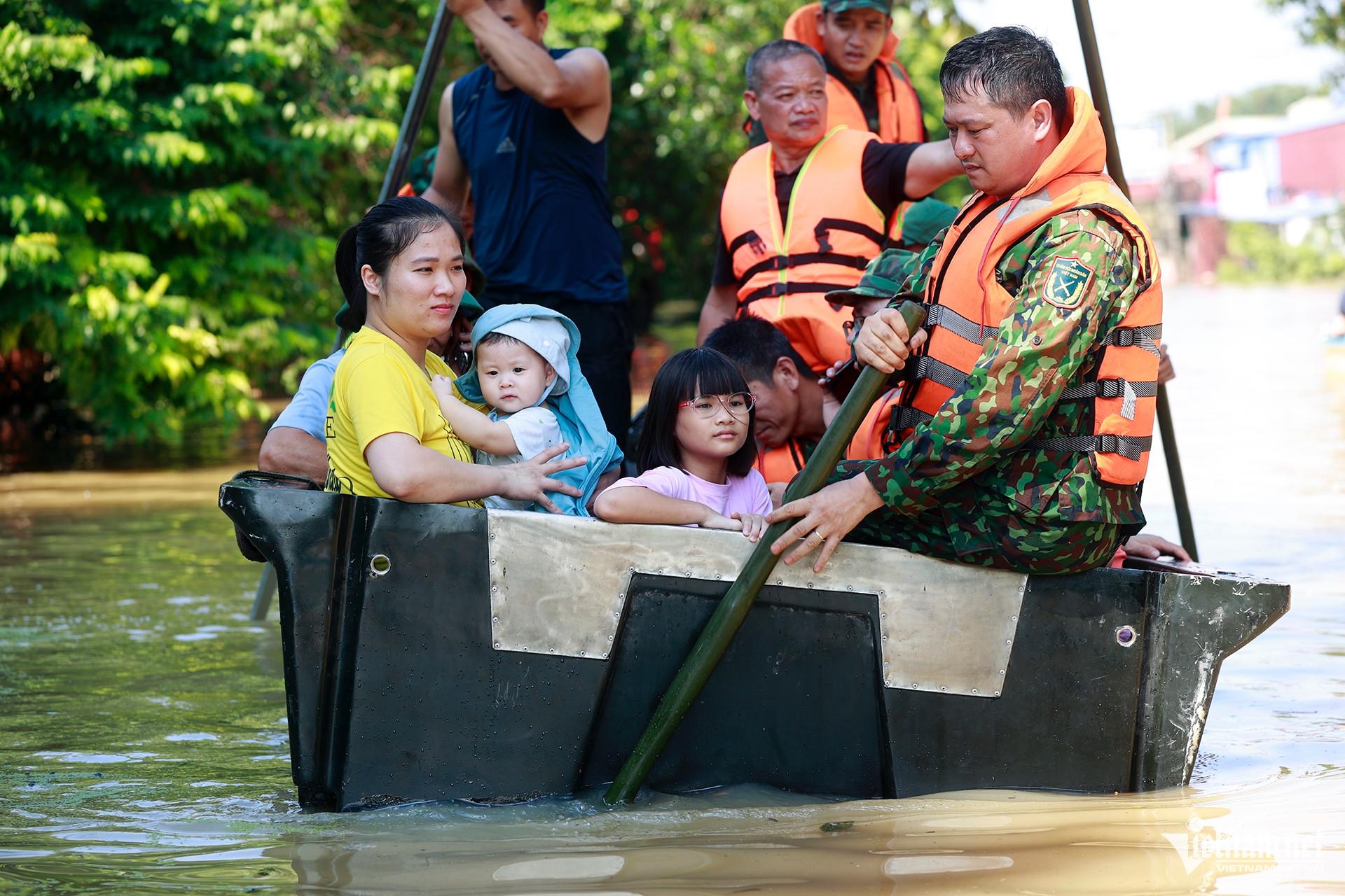 “Có gia đình của cặp vợ chồng với 4 trẻ nhỏ và 1 cụ bà đang ốm nặng. Nước dâng cao đột ngột khiến họ loay hoay trở tay không kịp. Nhận được thông tin, 10h30 sáng, đội cứu trợ của thôn đã chèo thuyền đến đón, kịp thời đưa cụ bà đến Bệnh viện đa khoa Sóc Sơn cấp cứu”, ông Thống chia sẻ.