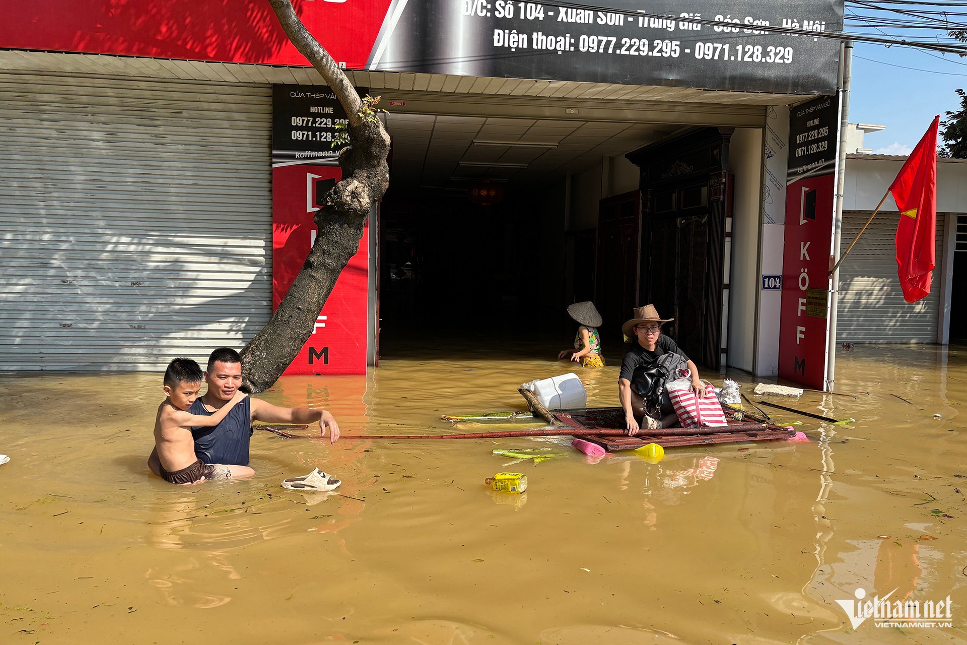 Người dân thôn Xuân Sơn chật vật trong dòng nước lũ.