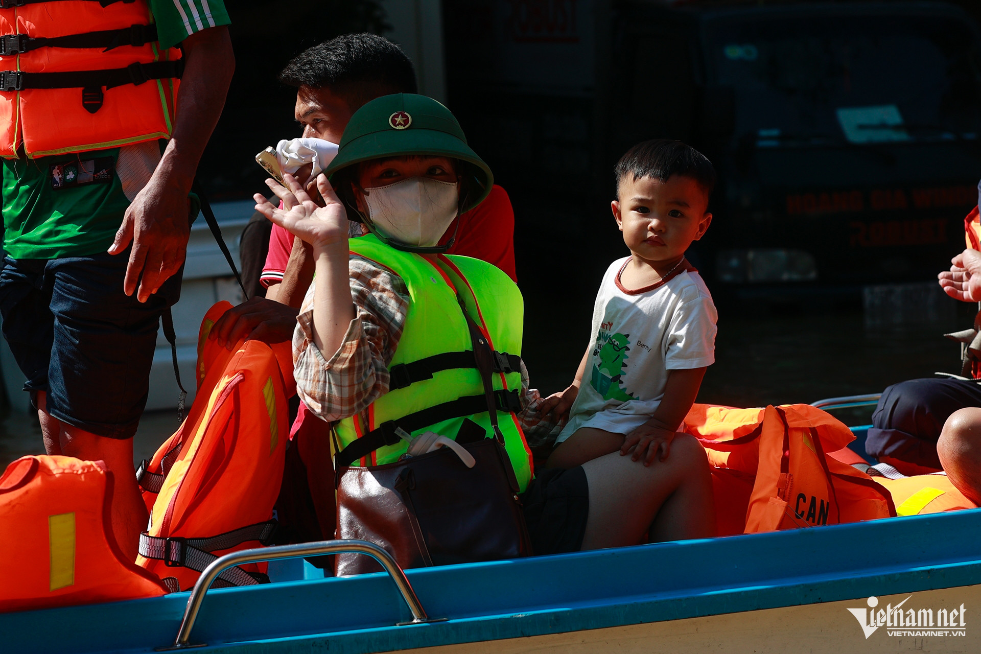 Chị Xuân bế con 8 tháng tuổi vượt lũ...
