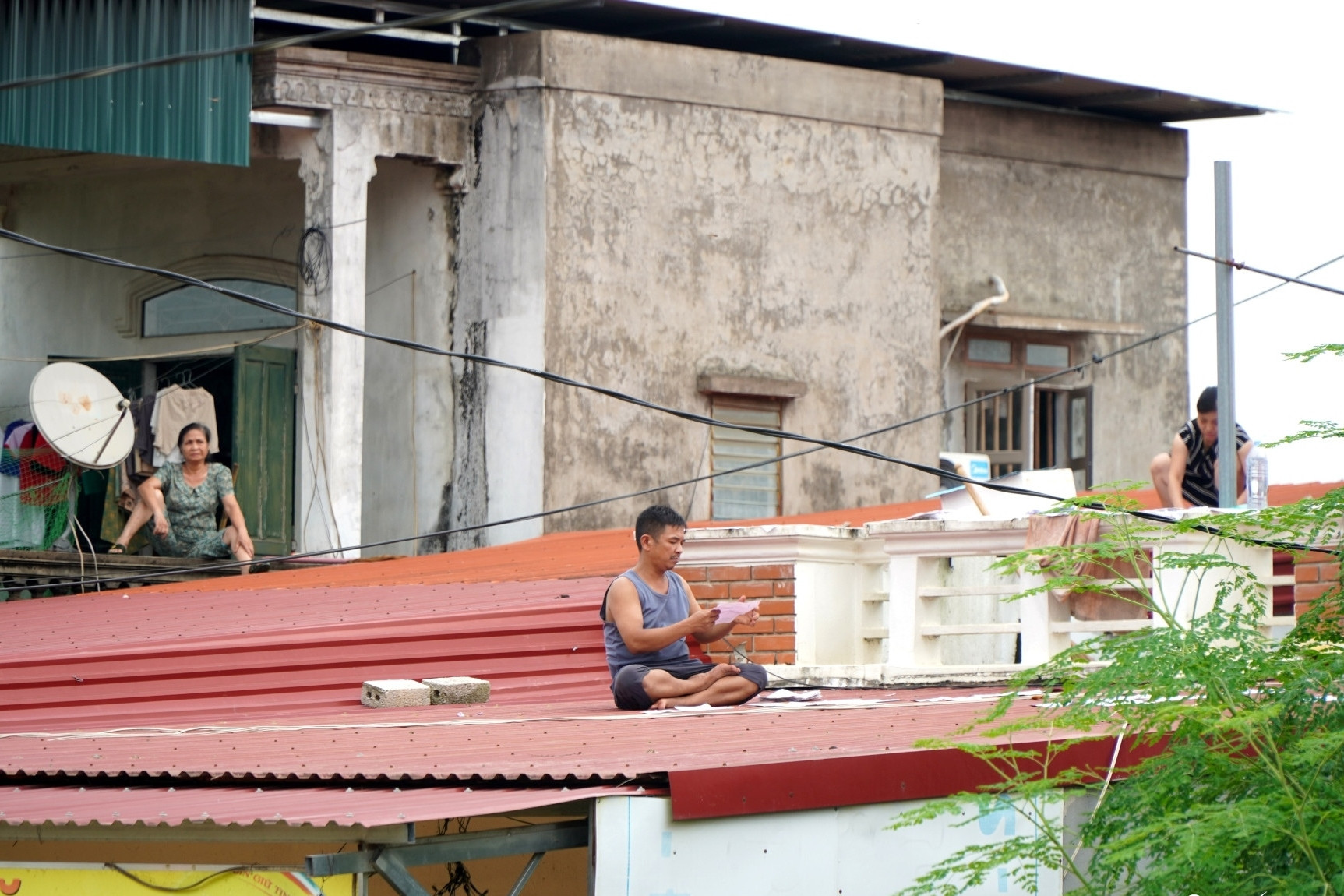 Theo người dân địa phương, những hộ có người già, trẻ nhỏ đều được sơ tán đến nơi an toàn. Các gia đình khác chủ yếu sơ tán tại chỗ, lên tầng 2 hoặc mái nhà kiên cố. Hình ảnh vật nuôi chen chúc trên mái, người dân sống tạm bợ trên cao vốn lạ lùng, nhưng ở Kim Tân lại đã trở nên quen thuộc.